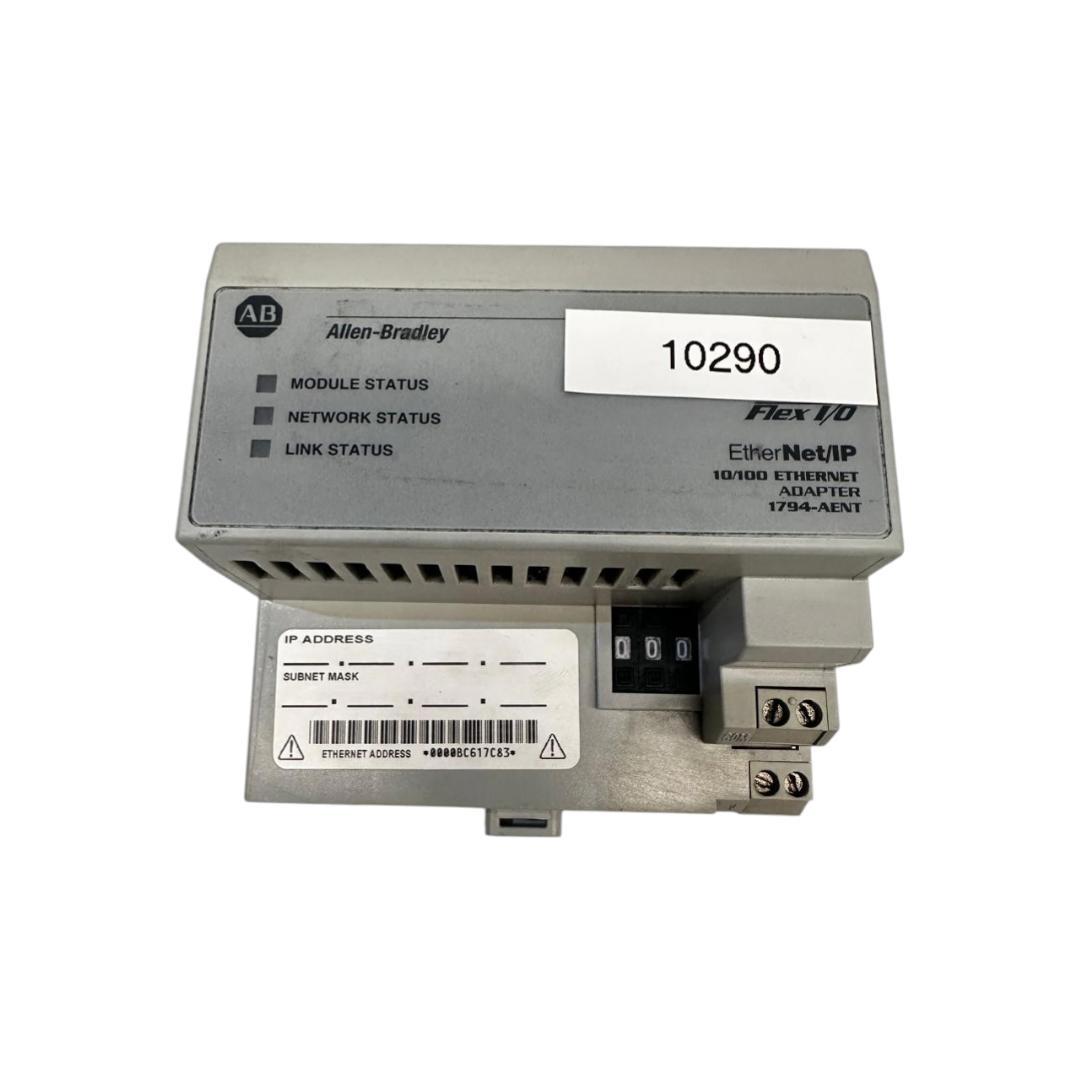 O Allen-Bradley 1794-AENT é um módulo adaptador de comunicação da linha FLEX I/O que permite a conexão de até 8 módulos de entrada/saída a uma rede EtherNet/IP